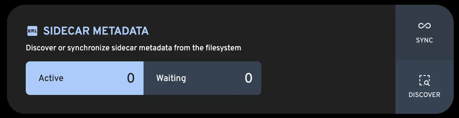 There are 2 administrator jobs associated with sidecar files: SYNC and DISCOVER. The sync job will re-scan all media with existing sidecar files and queue them for a metadata refresh. This is a great use case when third-party applications are used to modify the metadata of media. The discover job will attempt to scan the filesystem for new sidecar files for all media that does not currently have a sidecar file associated with it.
